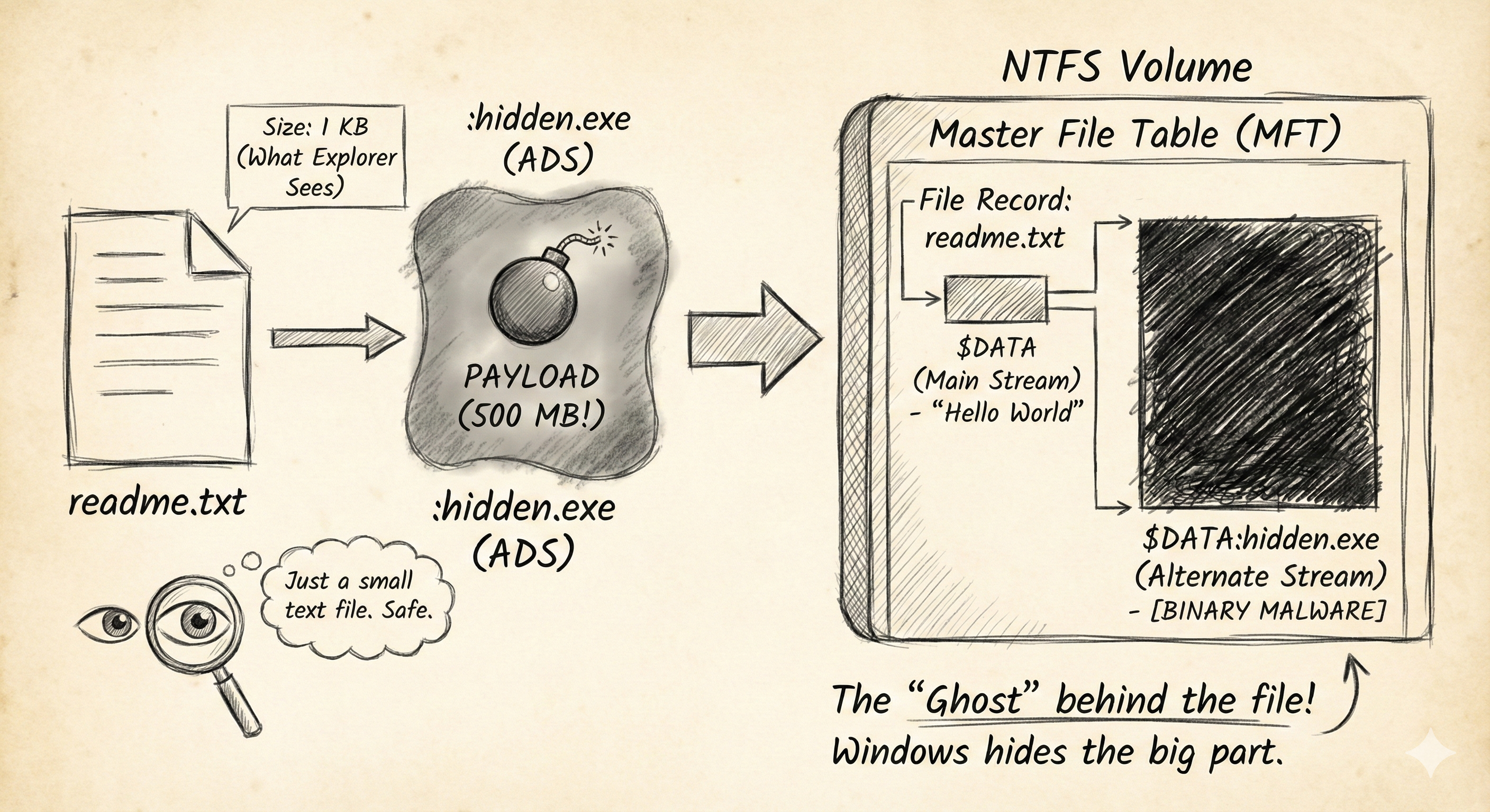 $DATA): This is what you see when you double-click the file. - Alternate Data Streams (ADS): These are hidden “backpacks” attached to the file. They can contain text, images, or even full executable binaries.