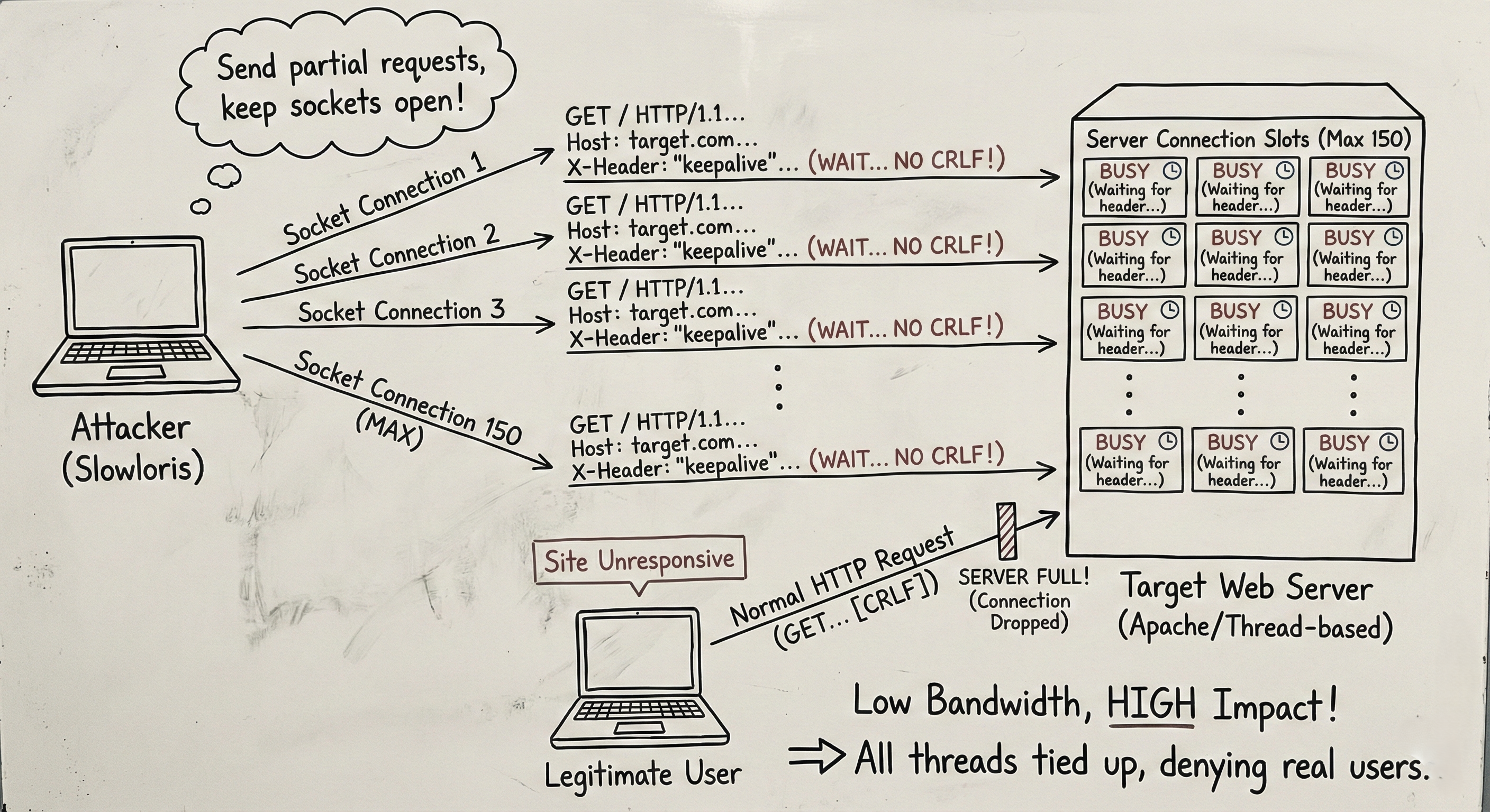 The server keeps the connection open, waiting for the rest of the request. The attacker opens 150 of these connections, using up every available slot. The CPU usage is near zero, bandwidth usage is tiny, but the site is completely dead to the outside world.
