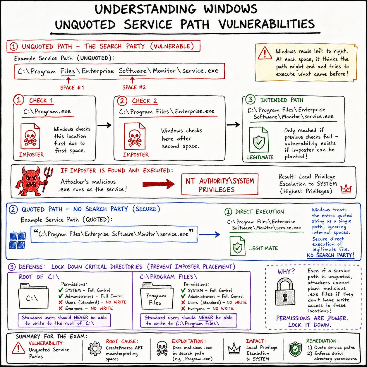 The vulnerability arises from a quirk in how the Windows API (specifically CreateProcess) handles spaces in file paths when the developer forgets to enclose the path in quotation marks.
